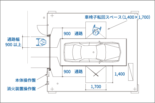 バリアフリー仕様の機械式駐車場は、車両を駐車する位置の両側に奥行1700mm以上、幅1400mm以上の乗降スペースを設けることができ、通路の幅も900mm以上を確保します。これによって乗降スペースで車椅子を回転させることが可能になり、そのまま駐車位置からスムーズに通路を移動できます。
