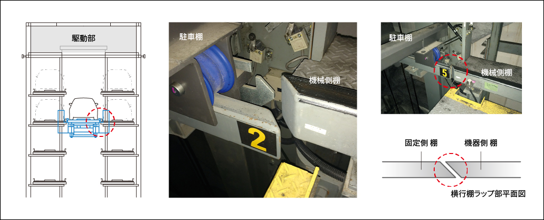 搬器~駐車棚への横行レール段差をなくし、搬器棚と駐車棚の先端をそれぞれ45°カットしてラップをさせます。そうすることで、横行時の騒音・振動が低減される機構となっています。