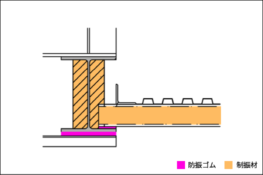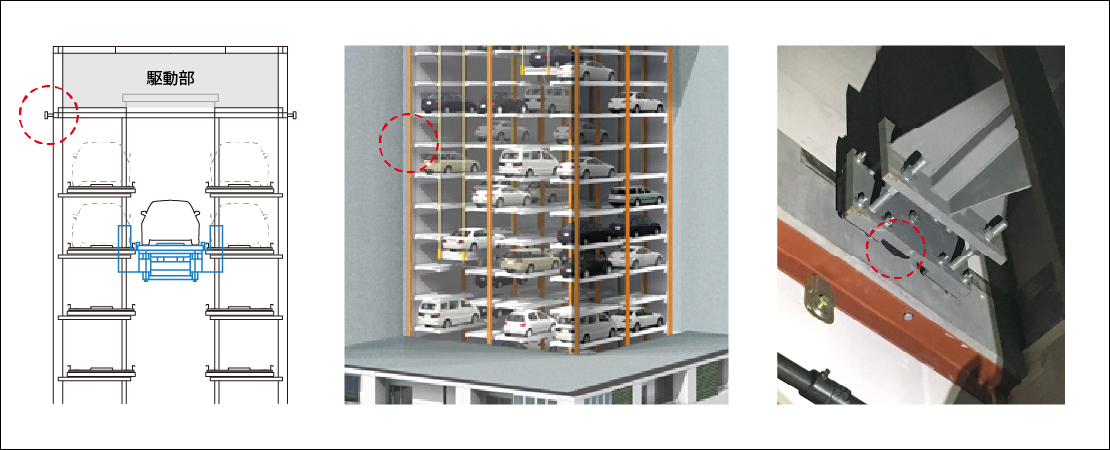 機械式駐車設備鉄骨と建築躯体を追従させる支持ブラケットにはゴムを設置し、建物側への振動伝達を低減します。