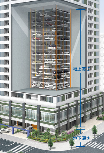 ※地上高=乗込FL~必要シャフト高さ上限まで、地下深さ=乗込FL~ピット水下